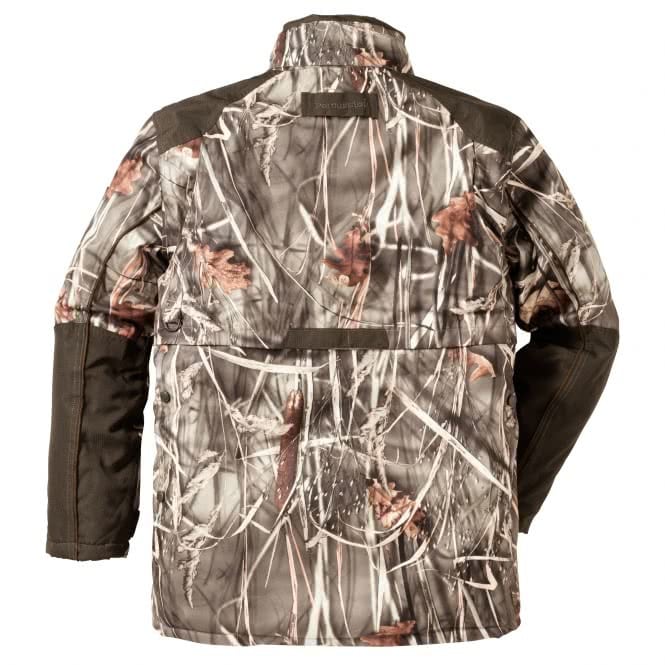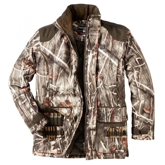 Percussion jas gemaakt van Skintane Optimum, een exclusief materiaal van Percussion met een gelamineerd membraan. Waterdicht-en ademend. De gewatteerde voering zorgt voor warmte op koude dagen,en de stormflap en de hoog afsluitbare kraag beschermen tegen externe invloeden. Zwaarbelaste gebieden zoals de kraag, manchetten, schouders en ellebogen zijn ersterkt met duurzame Oxford-bindingen. Een in de kraag geïntegreerde capuchon voorwanneer dat nodig is. Veel ruime zakken, zoals een waterdichte borstzak, 2 zijzakken, 2 steekzakken met geïntegreerde patroonlussen en 5 binnenzakken, bieden veel ruimte. De wildzak met polyurethaan voering kan aan 3 zijden worden geopend en wordt gebruikt als een waterdicht zitkussen naast de zakfunctie.Kleur: ghost camou wet.